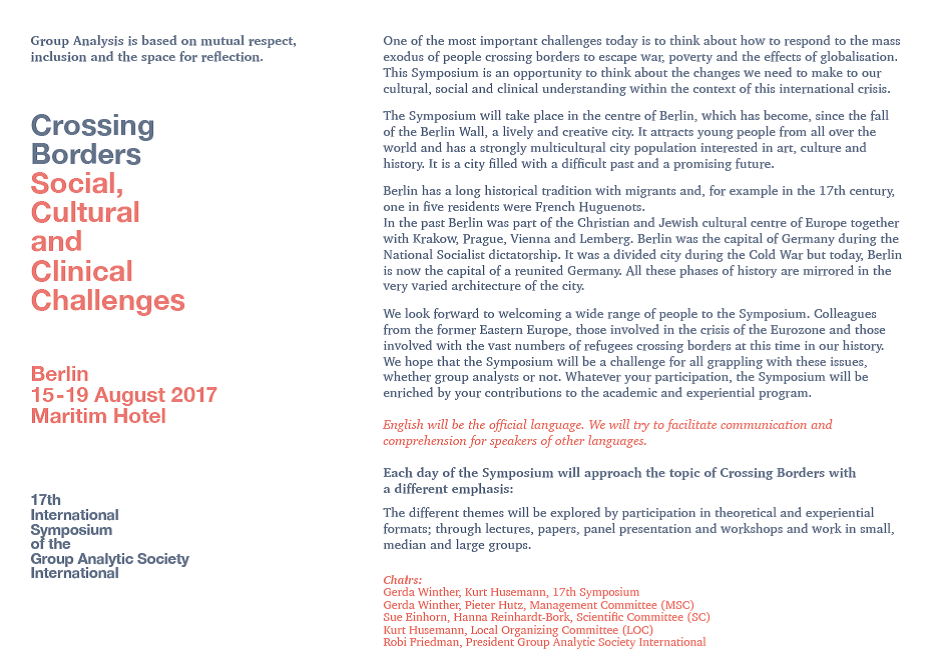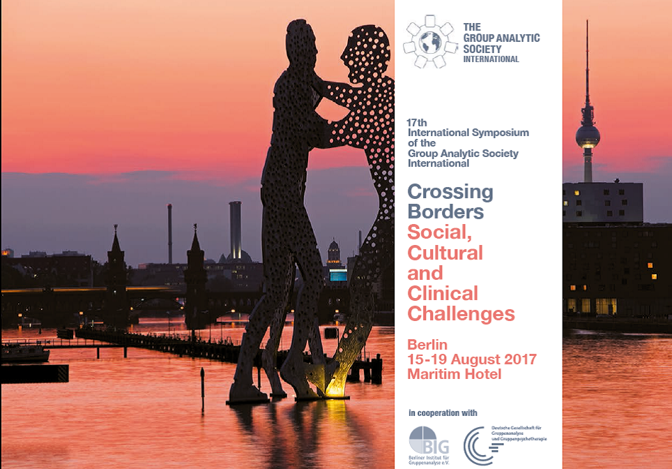 É com grande prazer que a Goup Analytic Society Internacional (Gasi) em cooperação com o Berliner Institut für Gruppenanalse e a Deutsche Gesellschaft für Gruppenanalyse und Gruppenpsychotherapie (D3G) vem convidá-lo para o 17º Internacional Simpósio em Grupanálise – Crossing Borders: Social, Cultural and Clinical Challengesem,  em Berlim de 15 a 19 agosto de 2017.