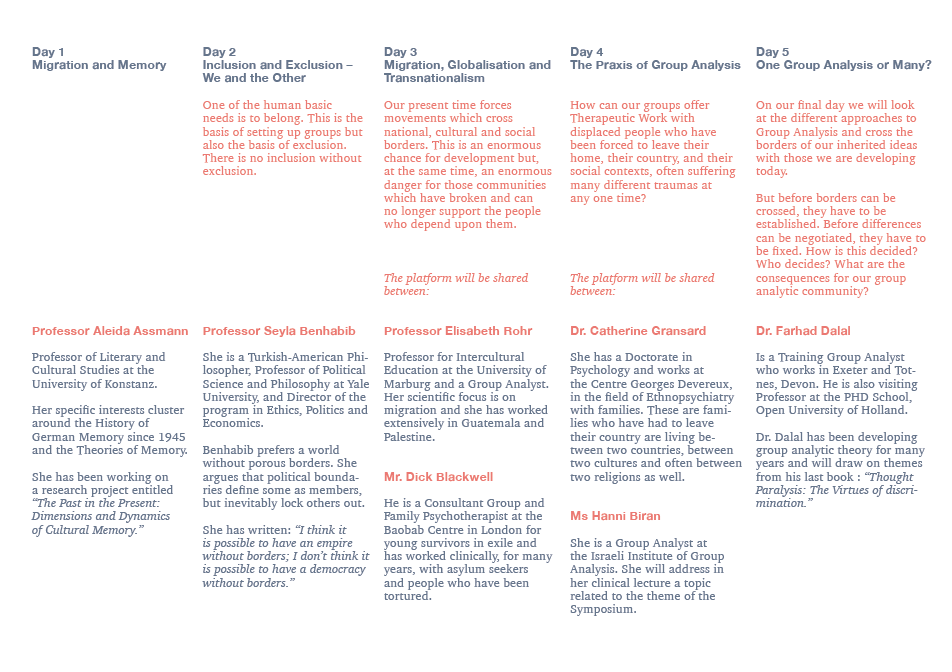 O tema do Simpósio vai direto ao centro do problema dos milhares de pessoas que se movimentam para longe das guerras e da pobreza, ou seja, na passagem das fronteiras. No contexto social existe um crescente medo de ser invadido por refugiados e imigrantes e sobretudo um medo de ataques terroristas. O nosso mundo atual é rápido e em constante mudança. É uma aldeia global onde a mistura e o choque de culturas colocam novos desafios para indivíduos, famílias, grupos e organizações devido ao perigo de desintegração social. Assim, como analistas de grupo e psicoterapeutas de grupo temos alguns instrumentos poderosos para ajudar a compreender e a analisar os fenômenos que vemos à nossa volta e esperemos que também posamos ser fundamentais para ajudar grupos de pessoas. Alguns podem dizer que não somos capazes de resolver problemas nesta escala maciça como eles são