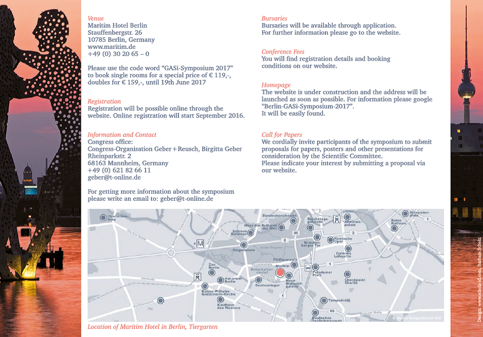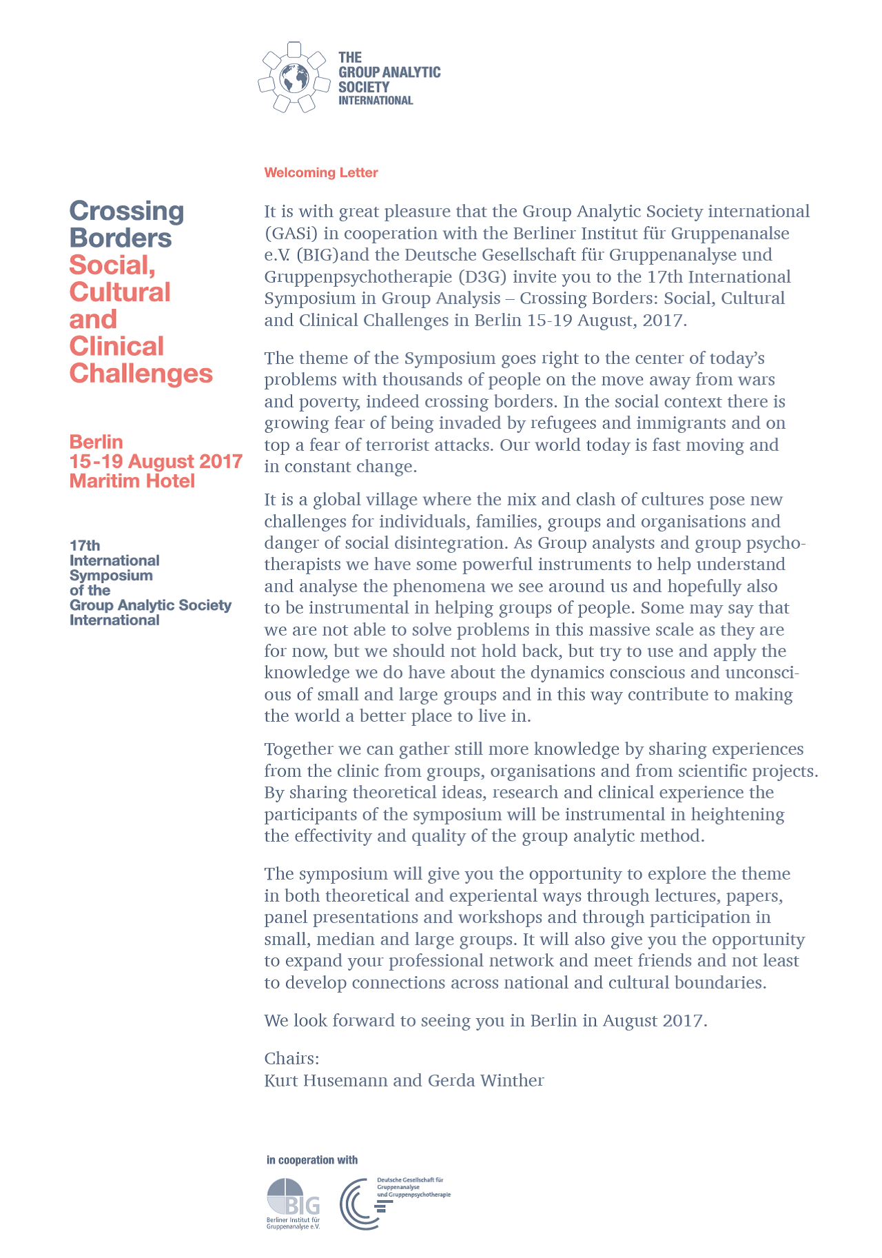 É com grande prazer que a Goup Analytic Society Internacional (Gasi) em cooperação com o Berliner Institut für Gruppenanalse e a Deutsche Gesellschaft für Gruppenanalyse und Gruppenpsychotherapie (D3G) vem convidá-lo para o 17º Internacional Simpósio em Grupanálise – Crossing Borders: Social, Cultural and Clinical Challengesem, em Berlim de 15 a 19 agosto de 2017.