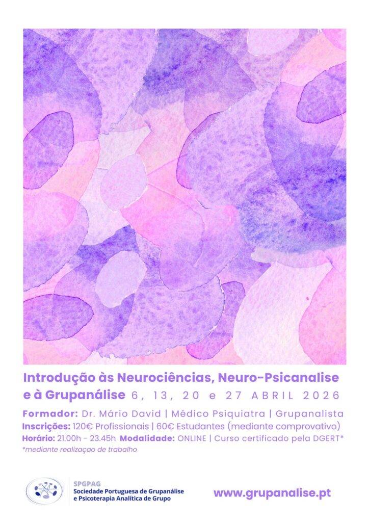 Encontram-se a decorrer as inscrições para a próxima edição do curso Introdução às Neurociências, Neuro-Psicanalise e Grupanálise leccionado pelo Dr. Mário David nos dias 6, 13, 20 e 27 de ABRIL de 2026.