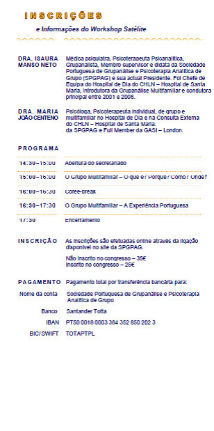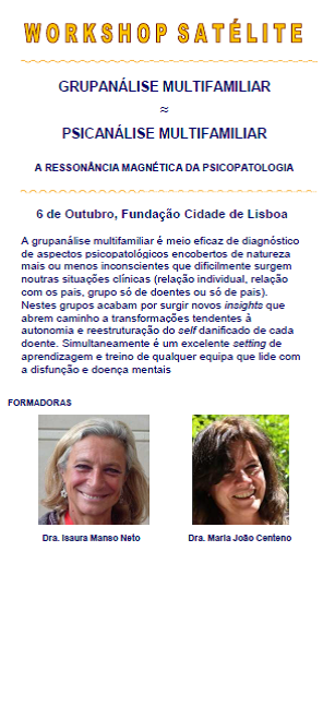 Inscreva-se no Workshop Satélite GRUPANÁLISE MULTIFAMILIAR / PSICANÁLISE MULTIFAMILIAR: A RESSONÂNCIA MAGNÉTICA DA PSICOPATOLOGIA que irá realizar-se no dia 6 de Outubro na Fundação Cidade de Lisboa.